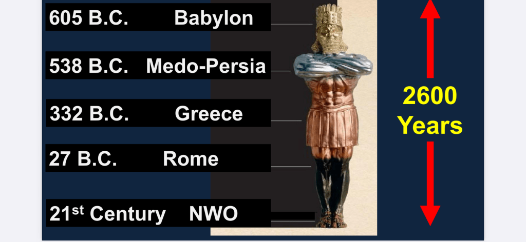 In Daniel 7 he has a vision of 4 kingdoms. Matthew Henry equated this vision as being a rehash of Nebuchadnezzar’s dream in an earlier chapter, and that was of successive kingdoms, starting with his own Babylonian Empire, followed by the Medio-Persian Empire, Alexander the Great’s Grecian Empire, the Roman Empire, and the final empire of the Antichrist, which we will refer to as the New World Order, NWO, here on out. Commentators for centuries have followed suite with Henry. But I believe this vision is about 4 end time nations, that coexist, and are not successive.